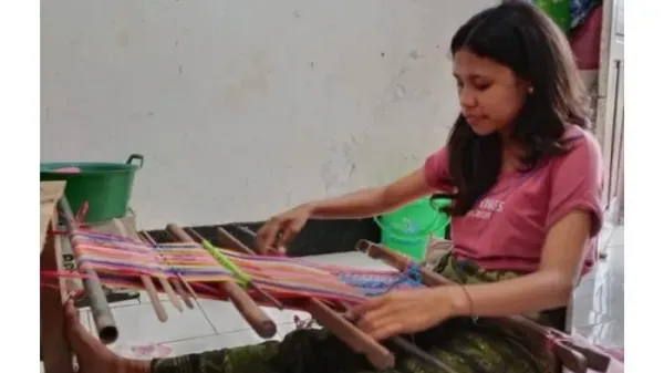 Kadang ia menenun sambil mengikuti kuliah daring, menggabungkan pendidikan dan tradisi.