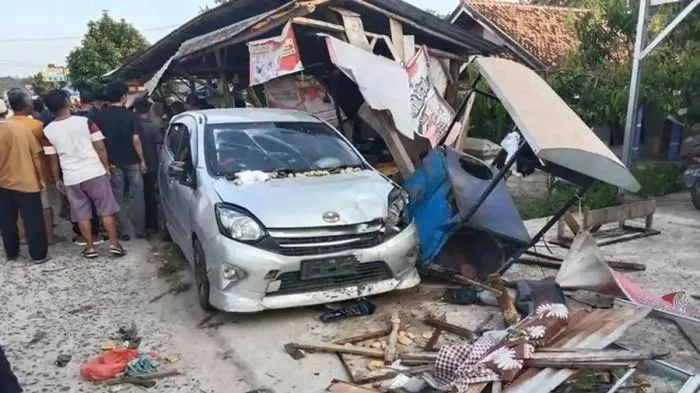 Tabrakan ini mengakibatkan sejumlah korban terluka, sementara kondisi mobil dan warung gorengan mengalami kerusakan signifikan.